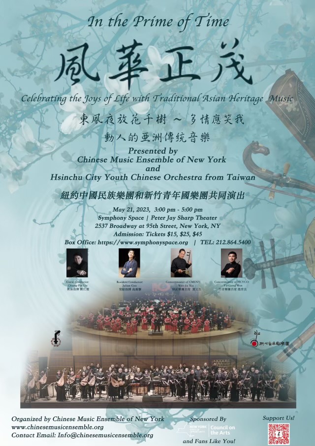 纽约中国民族乐团 (CMENY) 成立于 1961 年,是一个 5013 非营利组织,致力于与纽约大都会社区分享亚洲传统音乐之美。 CMENY 的使命是保护和延续中国本土独特的文化遗产,提供并与当地社区合作开展音乐和艺术活动。 来自台湾的新竹市青年国乐团(HCYCO)自2011年成立以来,一直致力弘扬华夏传统音乐,并致力走向国际。 HCYCO不仅拥有高超的演奏技巧和丰富的演奏经验,更以和谐的音色和出色的团队合作,被誉为台湾“最具活力和实力的民族乐团”。