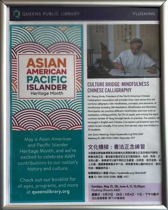 5月21日在纽约皇后区图书馆有 文化橋樑: 書法正念練習